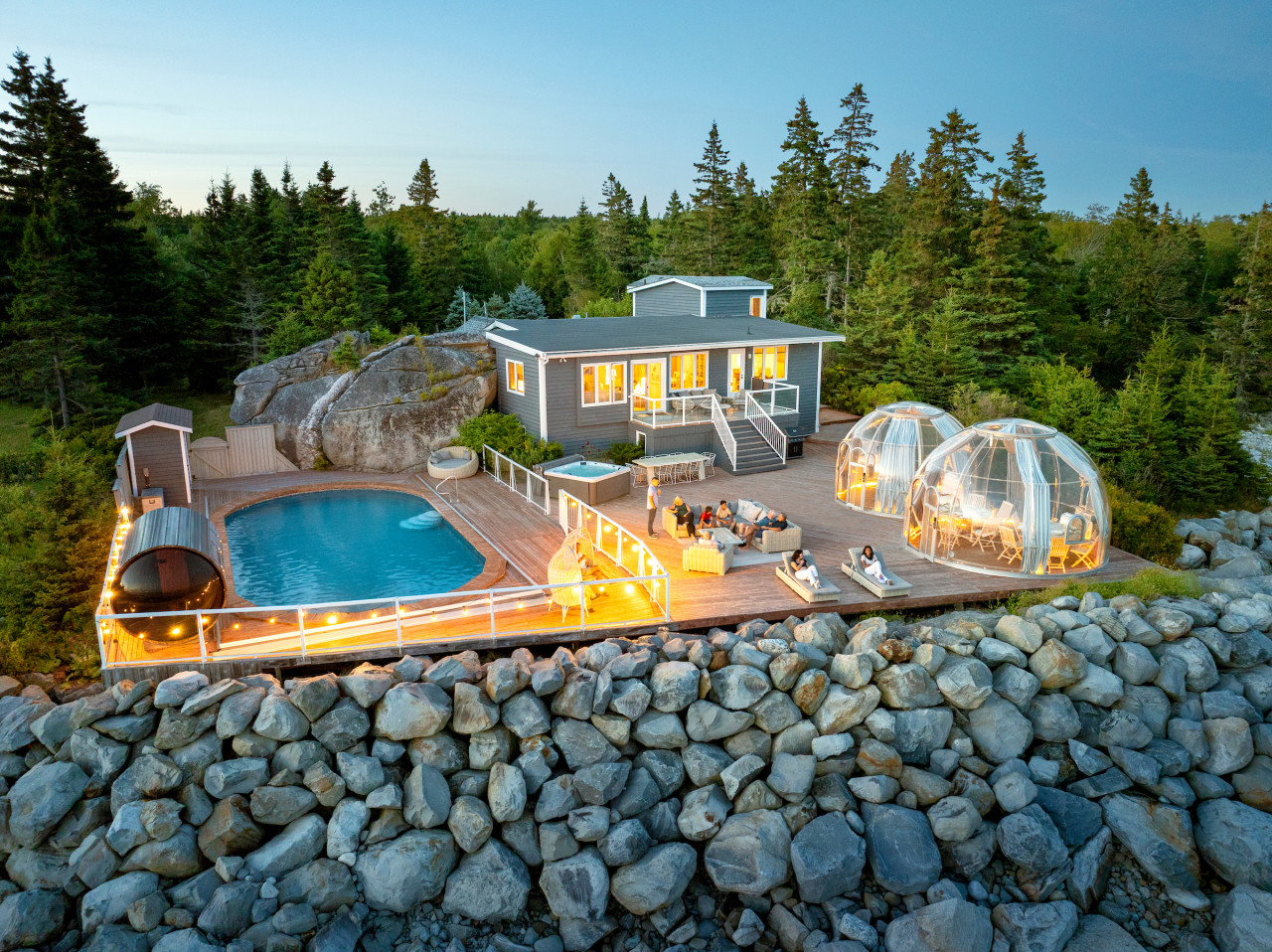 This spacious 3 bedroom mature and charming vacation home is more like a private resort offering a 4000 square foot deck on the ocean front complete with large heated pool, hot tub, panoramic barrel sauna, climate controlled clear domes for an all season experience with plentiful patio furniture for lounging or dining. Set back from the main road behind trees and gate, the house is surrounded by a rocks . It's located on the South Shore of Nova Scotia, 5 minutes drive from 2 of Nova Scotia's best resorts and the most beautiful white sandy beaches in Nova Scotia. This house is the perfect getaway for anyone looking to escape the city to find tranquility, privacy and seclusion. Our spacious 3 bedroom House includes 2 queen beds, 2 twin beds, 3 queen size sofa beds and a double futon. The house offers 2 full bathrooms and 3 half bathrooms. Each bedroom is located on a separate floor, offering guests maximum privacy. This location is the perfect base to explore the best beaches in Nova Scotia or simply get away from it all.